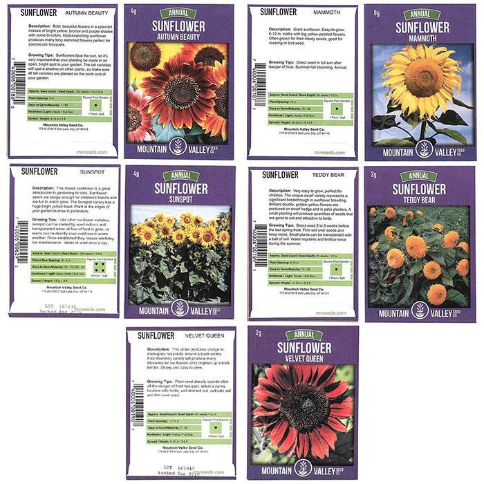 90 - 110 days. Growing 5 Varieties sunflower seeds is the easiest and most economical way to bring bold, vibrant, and diverse pairings of color at a discounted price. 5 Varieties seeds are available for bundle savings with 5 individually packaged varieties of some of the most popular sunflowers including Velvet Queen, Sunspot, Autumn Beauty, Teddy Bear, and Mammoth. 5 Varieties seeds include some of the hardiest and most drought tolerant sunflowers ranging from 2 – 12' tall with brilliant 8 – 12” heads bursting of spectacular color. 5 Varieties seeds are ideal for showcasing varied blooming along the back of a garden, fence, or any wide open spaces all summer long.