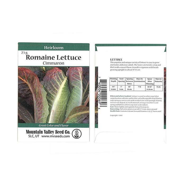 65 days. This charming heirloom romaine produces a 10 to 12 inch, deep-red head with good flavor and a crisp tender texture. Virtually impervious to bolting. These non-GMO Cimarron seeds grow into vibrant, red heads of lettuce that are ready to harvest in 60 to 70 days. The Cimarron lettuce can be grown in most zones, including colder zones. The leaves of the Cimarron have a mildly sweet flavor. Approx. 16,000 seeds/oz.
