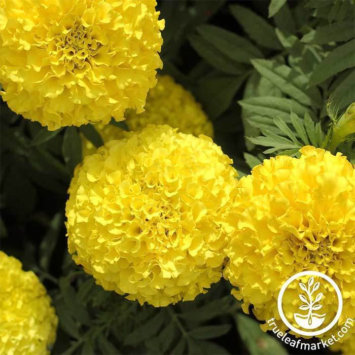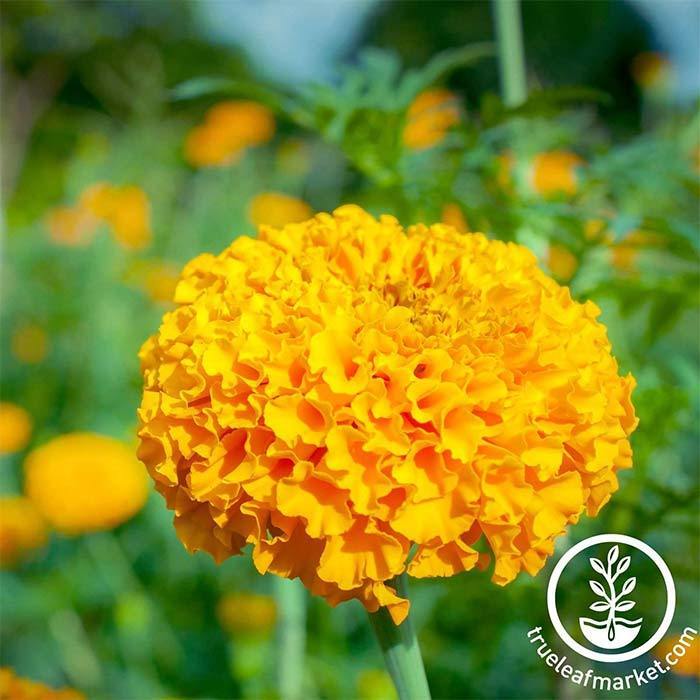 • Growth Habit: 10 – 12” tall bushy mound with a 12” spread of enormous 4” classic fully-double marigold blooms