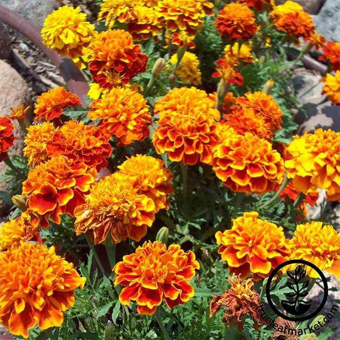Sparky Mixture marigold is a hardy full sun performer and most commonly sown directly after the frost but, for earliest blooms, begin seeds 6 – 8 weeks indoors prior to the frost. Marigolds will take 7 – 21 days to germinate in full lighting. Plant 2 – 3 Sparky Mixture marigold seeds ¼” deep and 6” apart in average, evenly moist, and well-drained soil in full sun. Sparky Mixture marigold is a vigorous full sun performer native to Mexico and known to tolerate gardens prone to heat, drought, and clay soils. Plants must be properly drained and ventilated are may be susceptible to powdery mildew, root rot, leaf spots, and Botrytis. Marigold has no serious pests but monitor regularly for spider mites and thrips. Sparky Mixture marigold seeds mature in 63 – 77 days as 9 – 12” tall shrubby mounds with a 4 – 6” spread of 2 – 3” semi-double blooms.