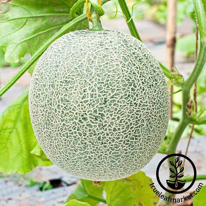 70-75 Days. Type: East/Tuscan Mini Melon with salmon flesh, heavy netting. Brix above 15%. Vigorous vine with excellent cover. Oblong-shaped fruit, thin rind and small seed cavity. Dark green, small-leafed plant with spreading vines out 8 to 12 feet. Vines are lightly spined with tan netting and green stripes in light sutures. Salmon colored flesh with small seed cavity. Fine grained fruit, very sweet flavor; 13-15% Brix; 4-4.5" diameter weighing 2-2.6 pounds. Excellent melon.
