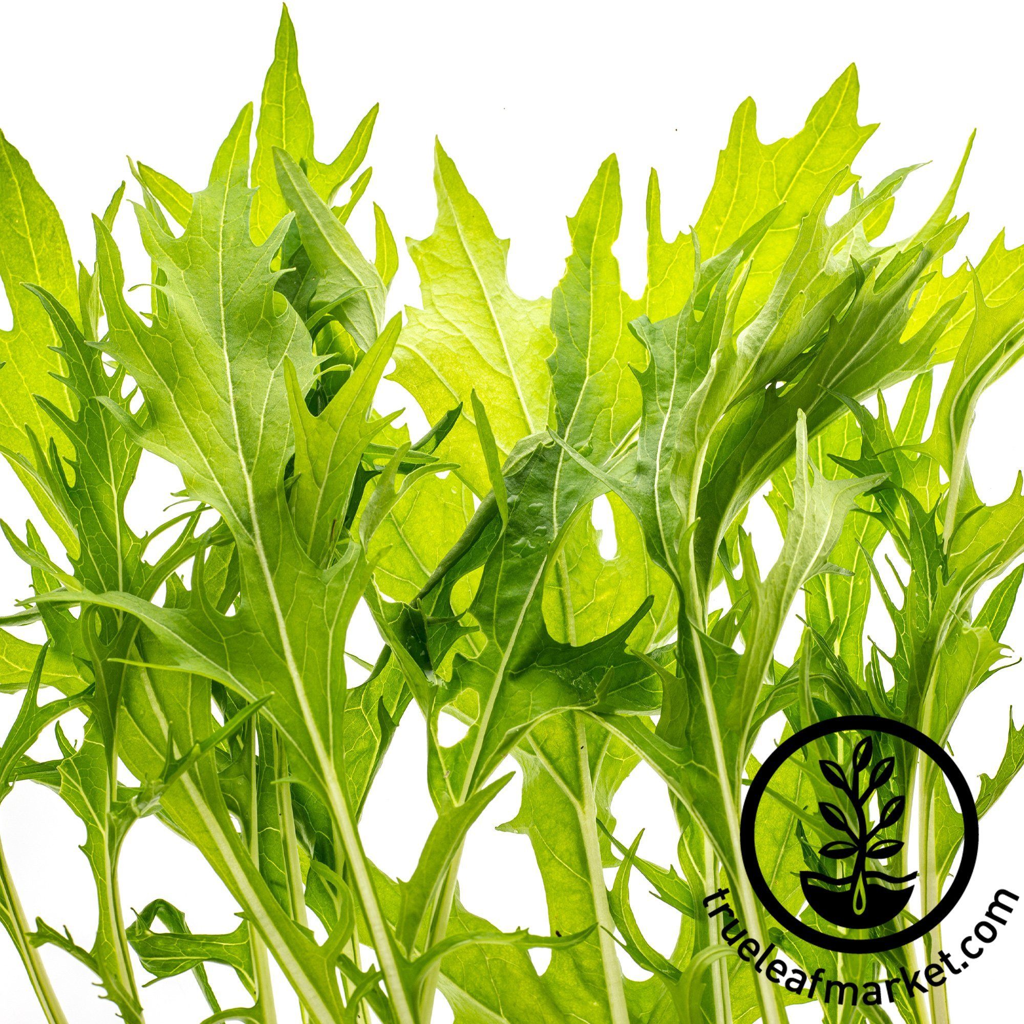 45 Days. Brassica rapa var. japonica. Non-GMO. Annual. Heirloom. Wonderfully serrated and ornamental heirloom baby-leaf mustard greens, Lime Streaks mizuna garden seeds grow a tangy and popular green for many garden salads. Bright lime-green uniform color when harvested young, Non-GMO Lime Streaks mizuna seeds blend well with arugula, frisée, endive, and many culinary herbs. Known as “kyona” in Japan, mizuna is translated from Japanese meaning “water greens” for its easy and moist garden conditions, an ideal variety to grow from seed. Paper packet to bulk sizes available. ~15,000 seeds per ounce.