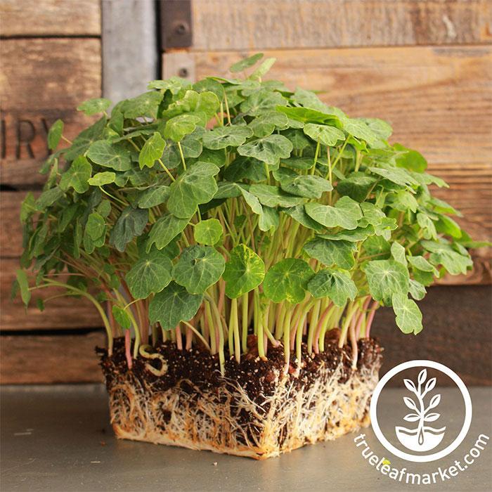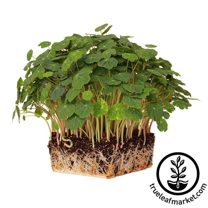 Alaska Mix Nasturtium is a marvelous microgreen. With its round wavy, lily pad like green foliage and a mix of green and pink stems it is beautiful and tasty too! A bit sweet with a peppery sharp bite and a succulent texture, it can't be beat. Makes a nice presentation with 2 to 3 leaves.