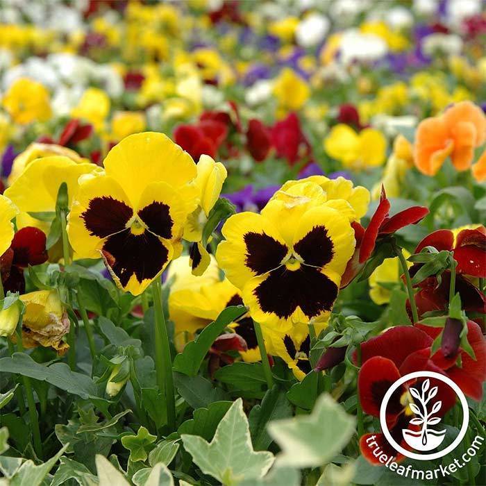91 – 98 days. Swiss Giant Mix pansy seeds grow a compact yet nevertheless dazzling alternative to the traditional viola. Swiss Giant Mix is easy to grow from seed and promises neat 24 – 30” spread and classic 3 – 4” blooms in a mix of “ink-blotted” petals in shades of crimson, rose, canary, blue, purple, and white. Swiss Giant Mix pansy seeds thrive in cool summers and are an ideal grow for indoor color and sweet aromatics. Swiss Giant Mix seeds grow tidy, hardy, and tolerant pansies perfect for gardeners with hanging space for baskets.