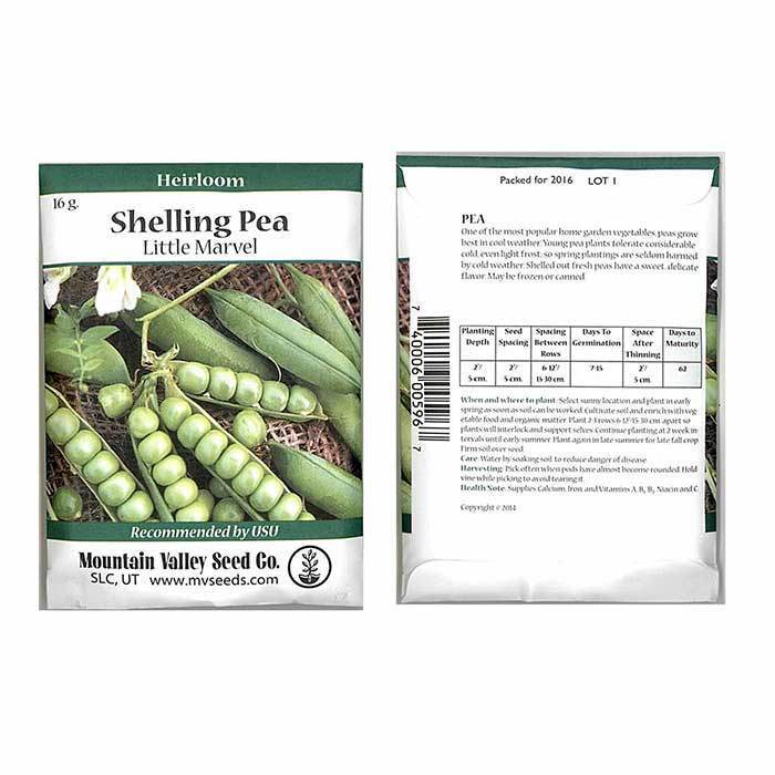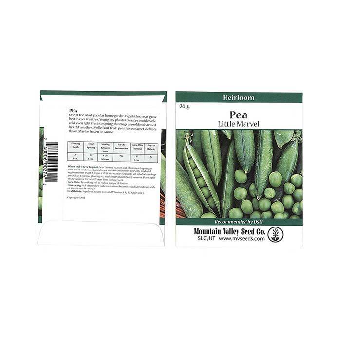 Little Marvel Pea Seeds: 60 days. Pods are 3 inches with 5 or 6 peas. Compact, 18 to 20 inch plant does not require staking. Fine, sweet flavor when picked young. Space saver. Good for freezing. Approx. 90 seeds/oz. Choose Pea Seed Quanity: