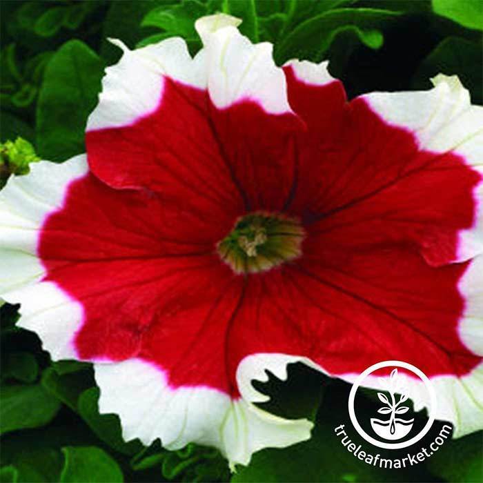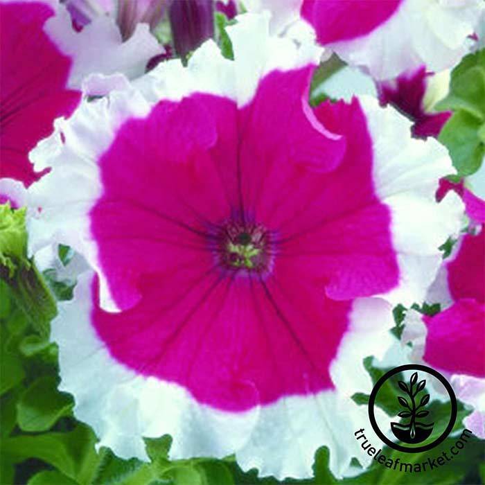 98 – 105 days. Frost Series seeds grow a delightful, unique, and lively variation to the world famous single-colored petunia. Frost petunia seeds deliver dazzling 3 – 4” wide bicolored blooms with an even white "picotee" lining in a signature choice of Velvet, Cherry, Fire, Blue, or Mix. Frost petunia seeds mature into hardy 12 – 15” mounds suitable for window boxes, hanging baskets, or for showing off outside in the flower bed. Frost Series petunia seeds promise early spring blooming and pollinators and will thrive as perennials in moderate, warm winters. 1000 pelleted seeds.