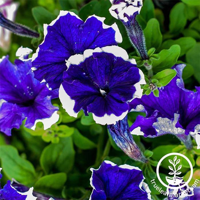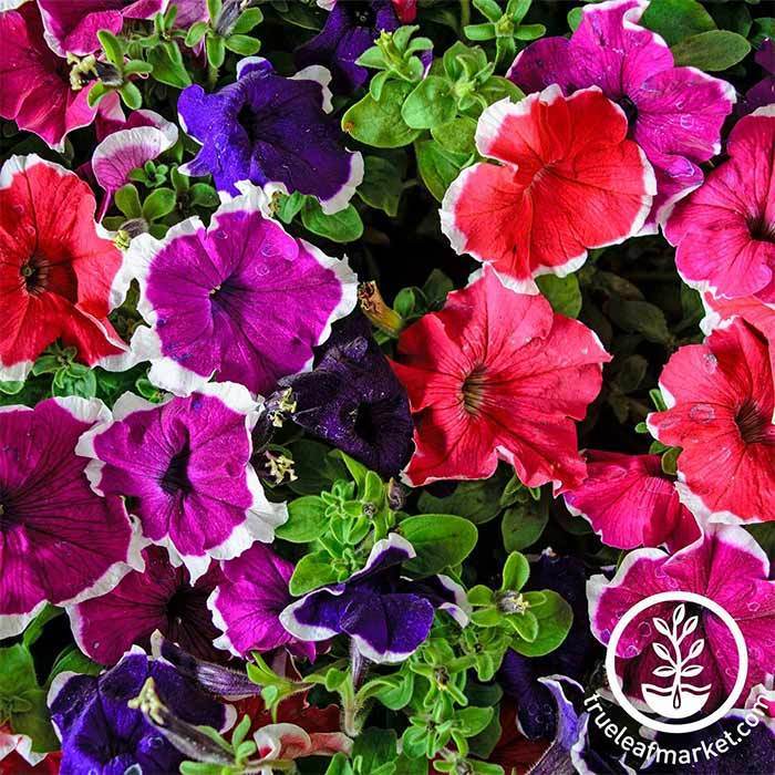 98 – 105 days. Hulahoop Series seeds grow a dazzling, fun, and unique variation to an already world famous seasonal collection of petunias. Hulahoop petunia seeds promise spectacular 3” wide "picotee" lined blooms in a choice of Blue, Burgundy, Rose, Velvet, Red, or Mix. Hulahoop Series petunia seeds grow exotic 10 – 15” tall mounding uprights that’ll feel right at home on the porch, patio, or as a classic ground cover lining the garden. Hulahoop Series petunia seeds are native to the warm tropics of South America and grow hardy spring blooms that will prosper as herbaceous perennials in warm, temperate winters. 1000 pelleted seeds.