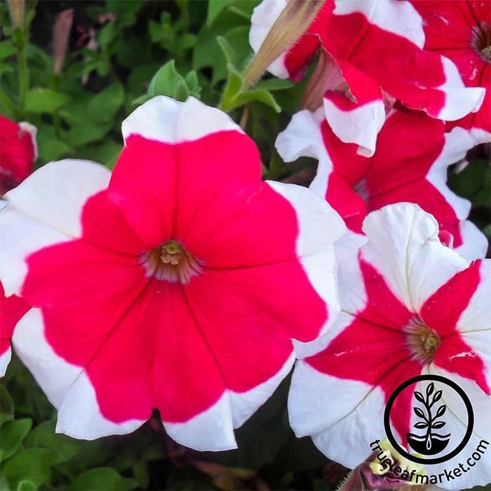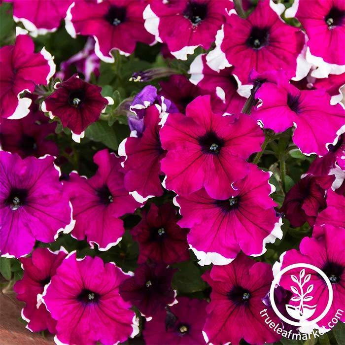 For earliest blooming, begin Hulahoop Series petunia seeds indoors 10 – 12 weeks before the final frost and transplant once there are two sets of true leaves. Hulahoop Series seeds will germinate within 14 days with full lighting. If transplanting outside, harden off seedlings into a partially shaded spot in the garden, or an equally moderate place indoors. Plant 2 – 3 Hulahoop Series petunia seeds ¼” deep and 10” apart in average, medium moist, and well-drained soil in full sun to partial shade. Avoid overhead watering to minimize wetting foliage as Hulahoop Series petunia seeds are susceptible to fungal and leaf diseases and gray mold if not properly ventilated. Plants are known to be susceptible to blight and tobacco mosaic virus, since Petunia x hybrida is closely related to the tobacco plant. Hulahoop Series petunias will benefit from shade and deadheading as they begin to decline in the long summer months. Petunias have no serious pests, but monitor regularly for aphids, flea beetles, slugs and snails. Hulahoop Series seeds mature in 98 – 105 days as 10 – 15” tall mounding uprights with a 10 – 12” wide spread of classic 3” bicolored "picotee" blooms in a signature choice of Blue, Burgundy, Rose, Velvet, Red, or Mix.