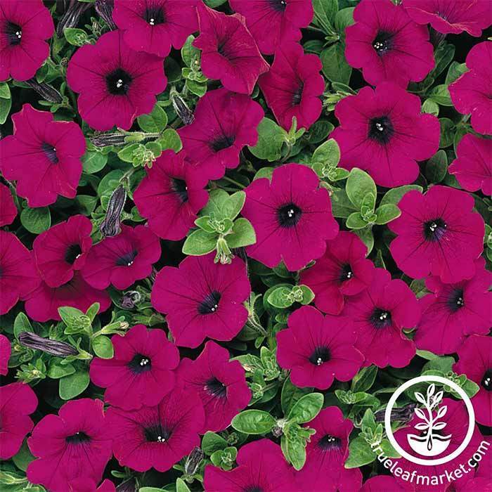 For earliest blooming, begin Wave Series petunia seeds indoors 10 – 12 weeks before the final frost and transplant once there are two sets of true leaves. Wave Series seeds will germinate within 14 days with full lighting. If transplanting outside, harden off seedlings into a partially shaded spot in the garden, or an equally moderate place indoors. Plants are very adaptable to being repotted. Plant 2 – 3 Wave Series petunia seeds 12 – 36” in average, medium moist, and well-drained soil in full sun. Wave Series seeds are hardier than most petunias and are drought tolerant, but avoid overwatering to minimize wetting foliage as Wave Series petunia seeds are still susceptible to fungal and leaf diseases and gray mold if not properly ventilated. Plants are known to be susceptible to blight and tobacco mosaic virus, since Petunia x hybrida is closely related to the tobacco plant. Petunias have no serious pests, but monitor regularly for aphids, flea beetles, slugs and snails. Wave Series seeds mature in 98 – 105 days as 4 – 8” tall trailing mounds with a 24 – 48” wide spread of classic 2” blooms.