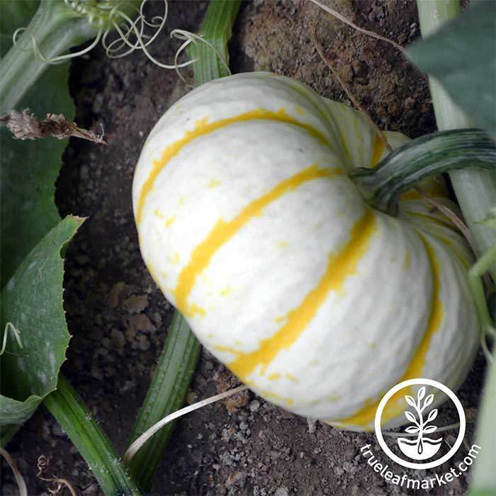 100 days. This mini-pumpkin features orange and green stripes on a white background for a unique look that your customers will love. Flattened shape with slight to medium ribbing emphasized by the orange and green striped. The 1 to 2 pound fruit is set on a compact vine that offers top yields and easy harvest. This pumpkin will add a nice mix to your traditional fall offering. Approx. 370 seeds/oz.