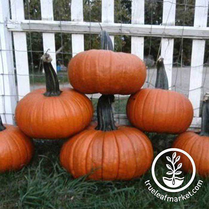 120 days. A new pumpkin variety characterized by it’s flattened or “Long Island Cheese” like shape, but with a dark orange color and an extra thick “handle” or stem. It averages from 15 to 25 lbs. These traits; color, shape, and handle, lend great interest. Thumpin grabs attention in any display. Thumpkin should be planted with plenty of room for the large vine. The producer recommends planting 1-3 seeds 6 feet apart in rows 12 feet apart, and will produce ABUNDANTLY at this spacing. Crowding produces fewer, but larger pumpkins.
