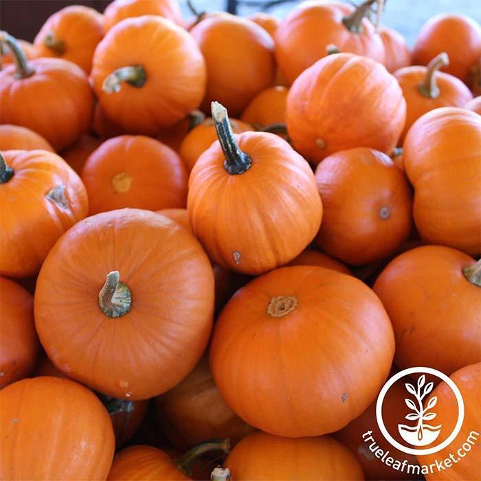 95 days. AAS Winner for 1999. True miniature orange pumpkin. This round pumpkin grows to a totally unique size of 8 to 12 ounce. Perfect for interior fall decorations. Easy to grow from seed. Bush habit spreads to only 6 to 8 feet. Approx. 300 seeds/oz.