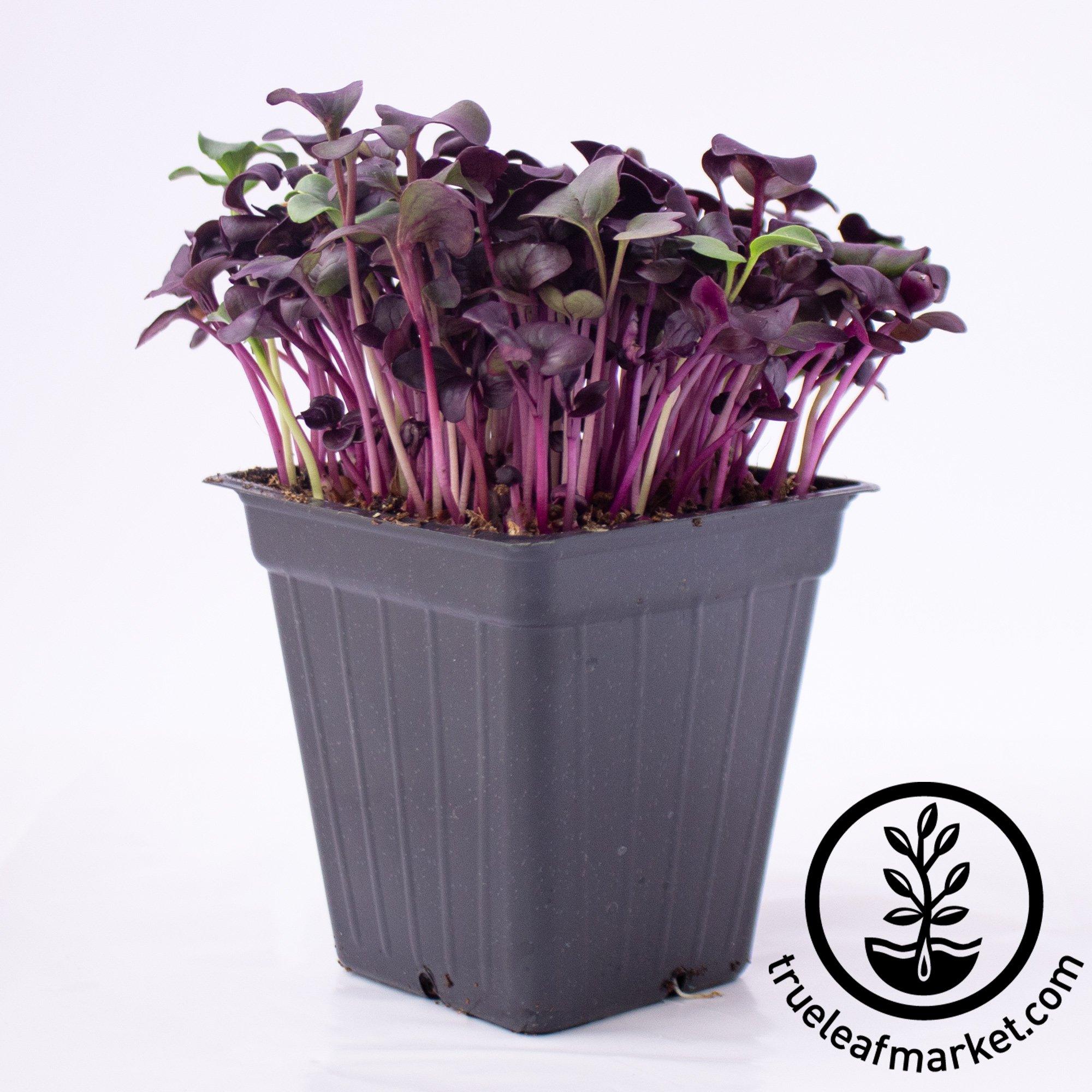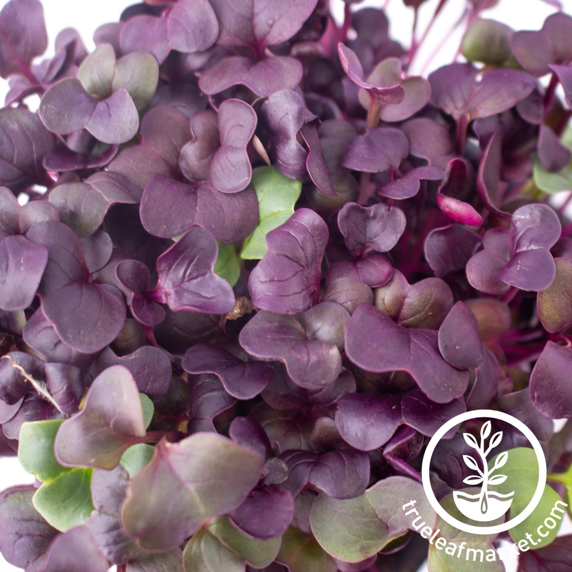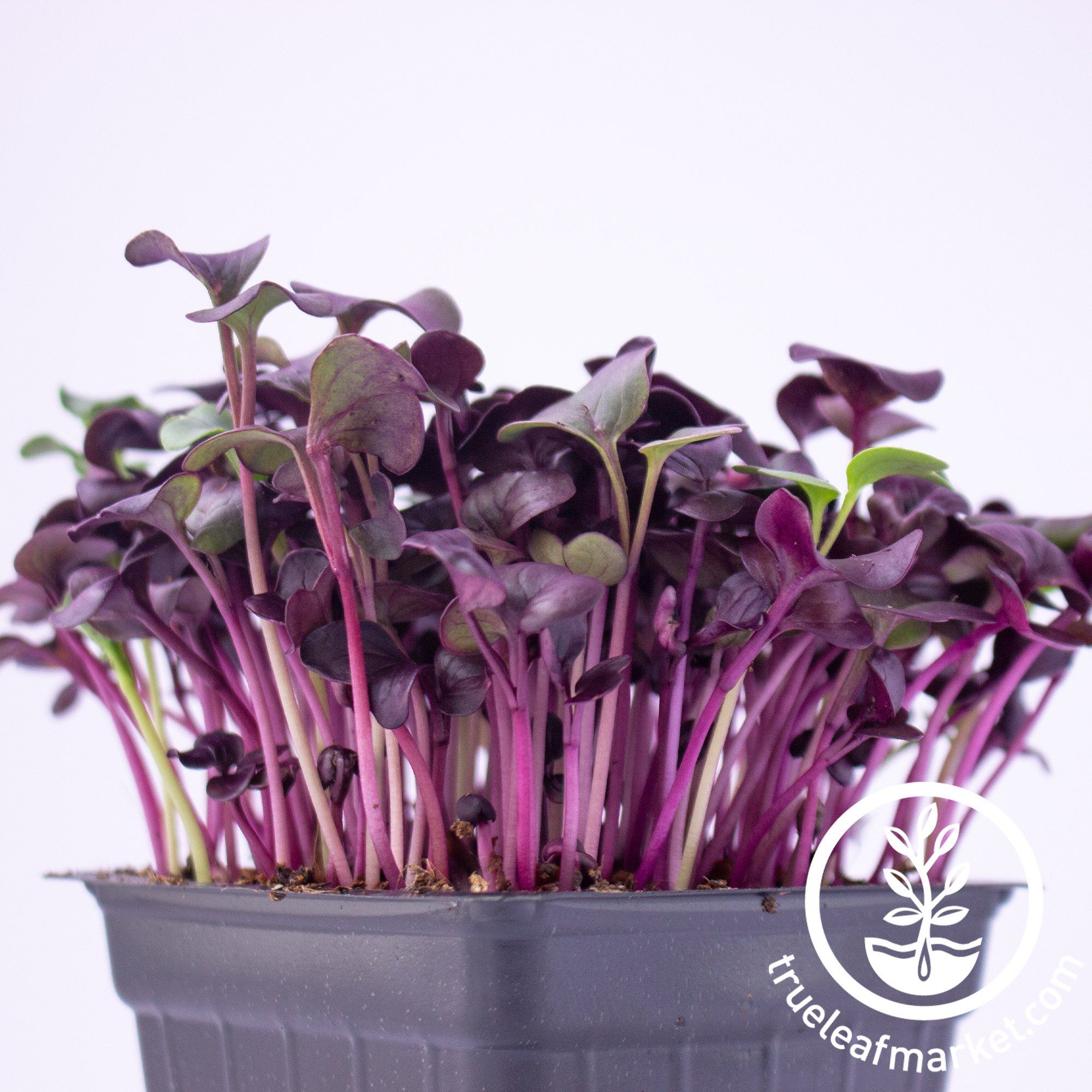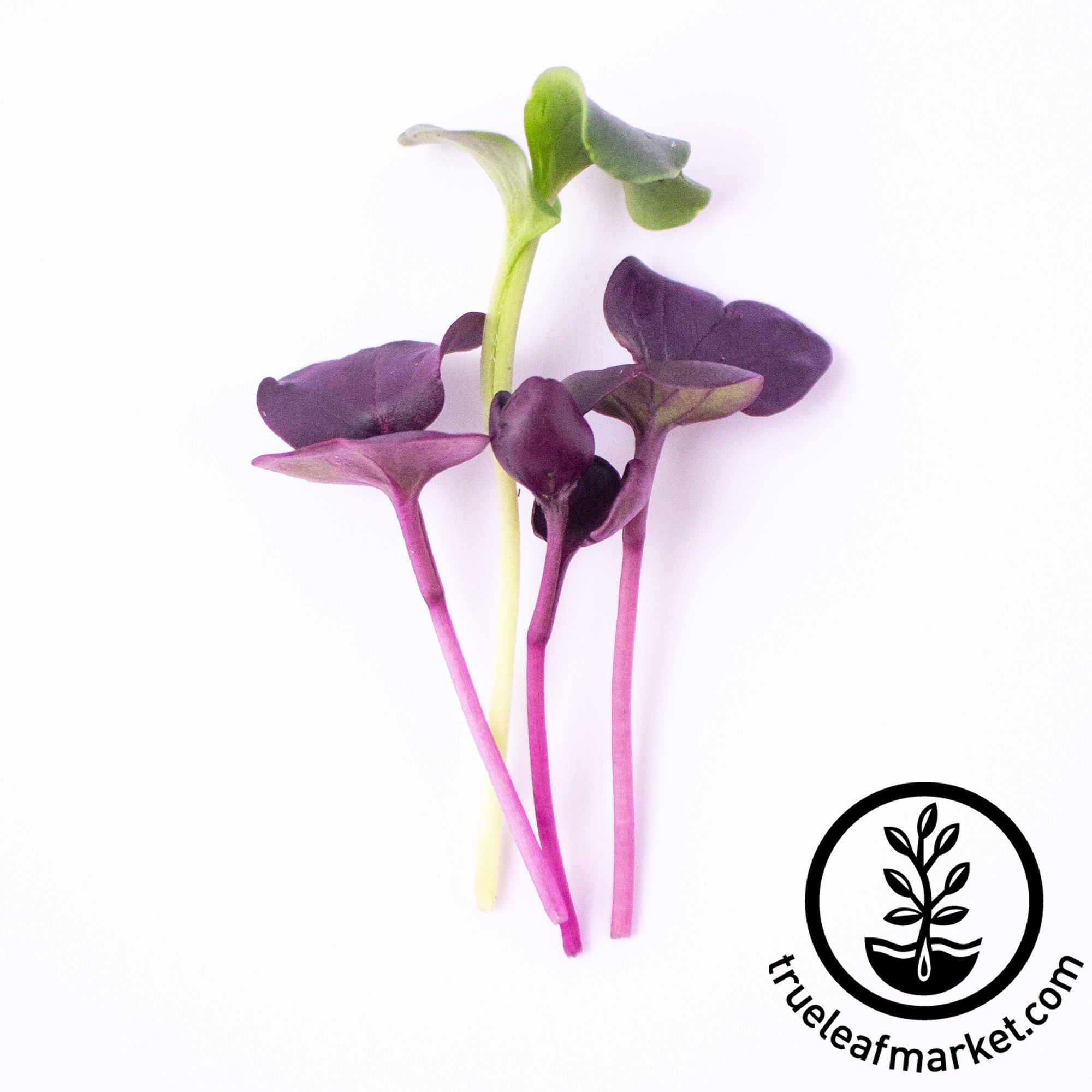 Purple radish is fast and easy to grow. The microgreen is substantial and very crunchy. Due to its fast growth it can be harvested as early as 5 days, assuming you have exposed it to light on day 3. You can flip the lid a day before exposing to light to strengthen the crop.