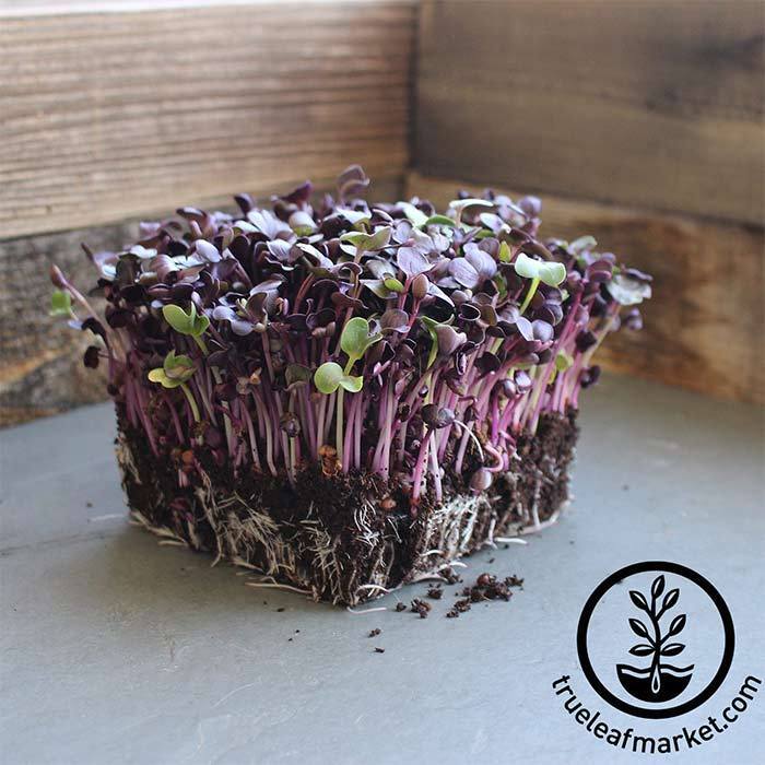 Sango radish is fast and easy to grow. The microgreen is substantial and very crunchy. Due to its fast growth can be harvested as early as 5 days, assuming you have exposed to light on day 3. You can flip the lid a day before exposing to light to strengthen the crop. A radish micro green with full flavor of spice and freshness. Sango radish is a spectacular shade of purple (with an occassional green) that adds crunch, radish flavor and amazingly colorful hightlights to any microgreen salad or full sized salad. Use instead of sliced radish anywhere you would normally use radish.