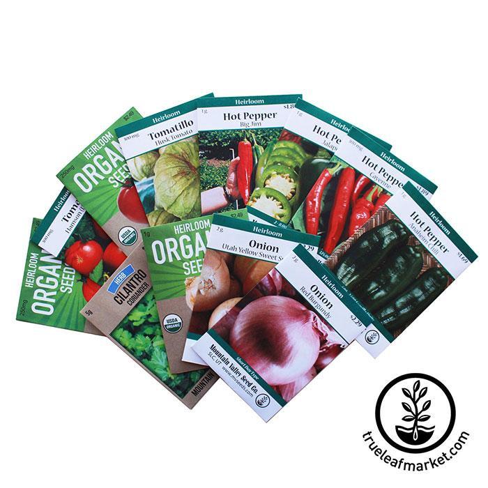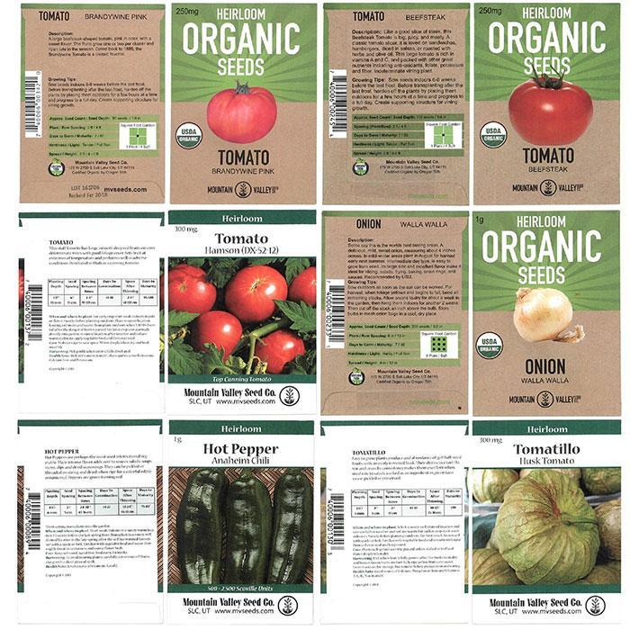 12 Seed Types: Beefsteak Tomato, Brandywine Tomato, Hampson Tomato, Tomatillo, Cayenne Long Red, Anaheim Chile, Jalapeno, Serrano, White Sweet Spanish Onions, Utah Yellow Sweet Spanish Onions, Walla-Walla, and Cilantro.