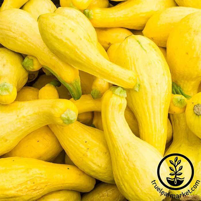 55 days. Bumpy, yellow, meaty fruits are 5 to 6 inches long. Slender curved neck. Holds and ships well. Excellent eating quality. Continuous yield. Approx. 380 seeds/oz.