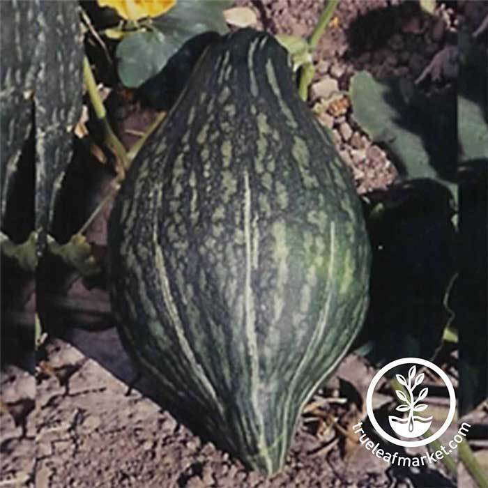 105 days. Dark green, moderately warted fruits average 8 to 12 pounds. Very hard rind. Orange flesh is thick, dry, and sweet. Approx. 130 seeds/oz.