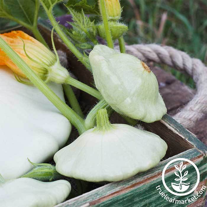 50 days. Pale green scalloped fruits are delicious when 3 to 4 inches across. Don’t turn your back on them though or they will turn into dinner plates. The fine textured flesh is also pale green in color. This semi open bush yields better than older bush scallop types.