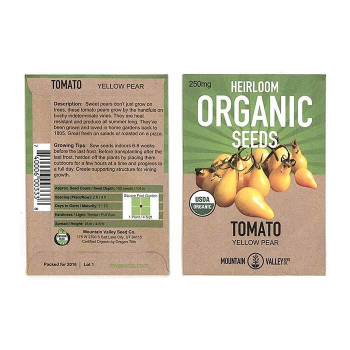 Non-GMO Organic Yellow Pear Tomato seeds. Yellow Pear Tomatoes (Lycopersicon esculentum) are unusually shaped cherry tomatoes, adorning a lovely yellow color that adds color to dishes! This indeterminate garden vegetable bears clusters of juicy little tomatoes.
