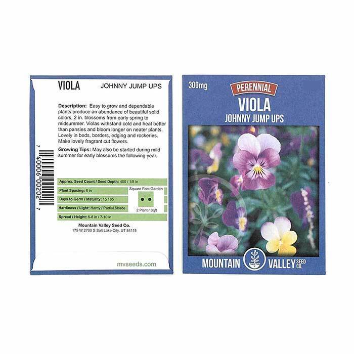 65 - 80 days. Johnny Jump Up viola seeds are a vibrant and compact addition to your spring, summer, or fall gardens! Johnny Jump Up viola seeds are perennials, often grown as annuals, that mature into neat 7 – 10” tall mounds sprinkled with miniature purple, gold, and lavender tricolored pansies. Johnny Jump Up violas are an edible variety known for their sweet and spiced mint petals used to garnish teas, iced drinks, desserts, sorbets, cakes, and any sweet dish in need of some quick color. Johnny Jump Up viola seeds can be grown in the garden as a timeless bedding or kept in the kitchen for delicious daily use.